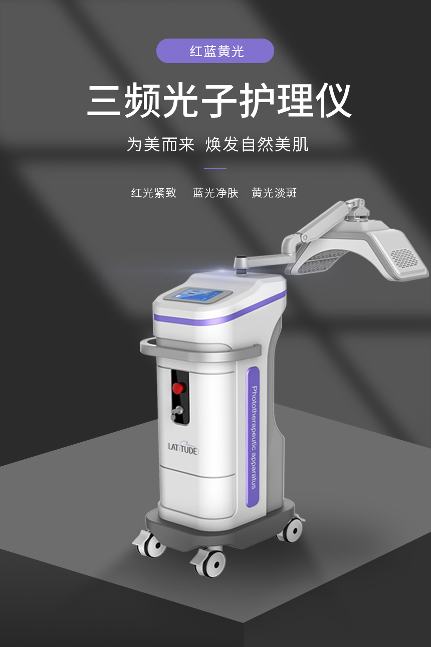 三频光子嫩肤护理仪通过对皮肤进行照射,能改变细胞结构,杀死细菌,为新生细胞提供一个适合的环境,增强新胶原质弹性蛋白和胶原蛋白的生成,促进细胞生长;能修复炎性痤疮老化肌肤、缓解日晒灼伤皮肤,而不伤害到皮肤,能美白皮肤、促进皮肤弹性;红蓝黄三色光组合护理(红光美白除皱,蓝光神奇祛痘,黄光淡斑嫩肤)。